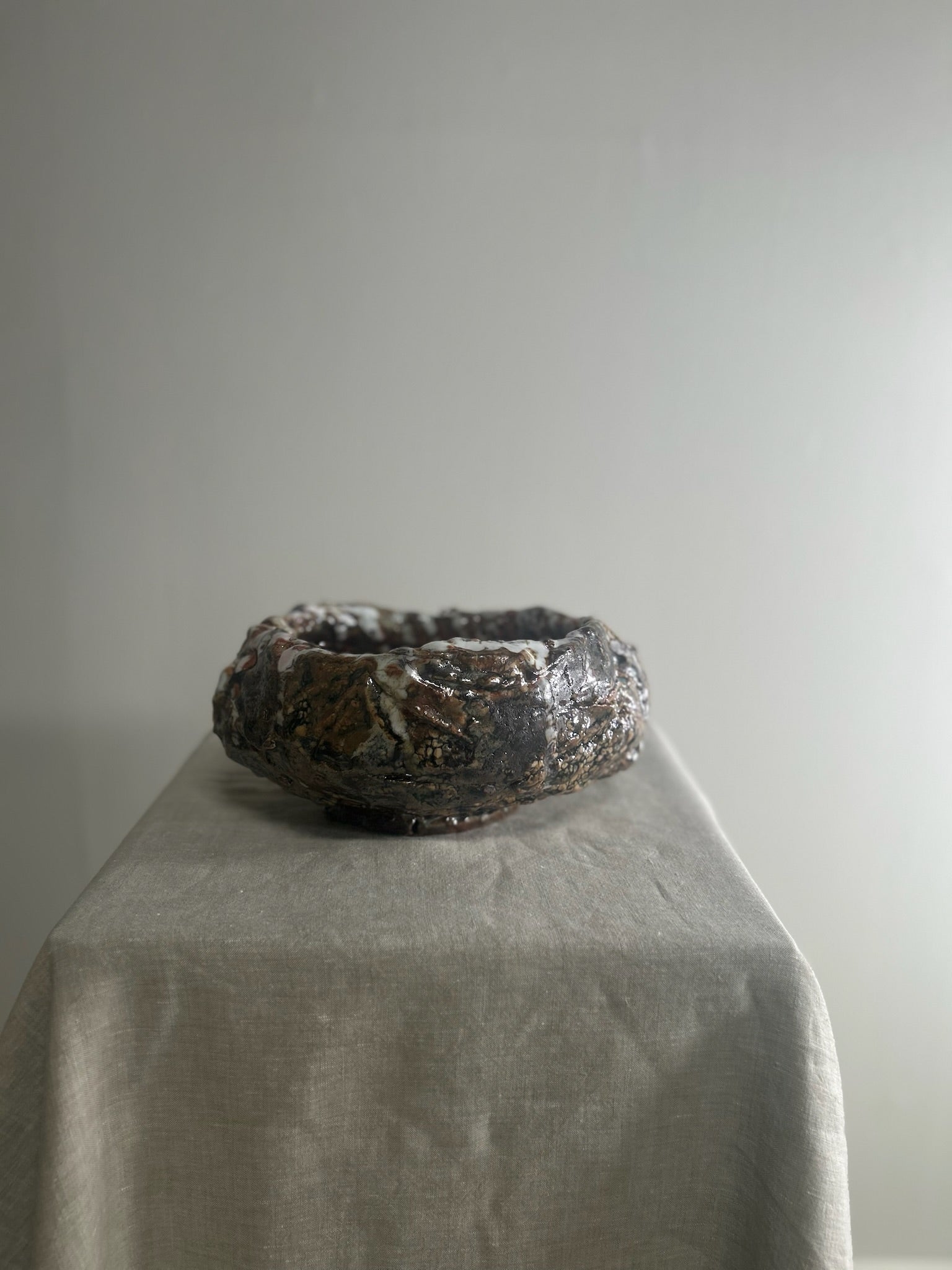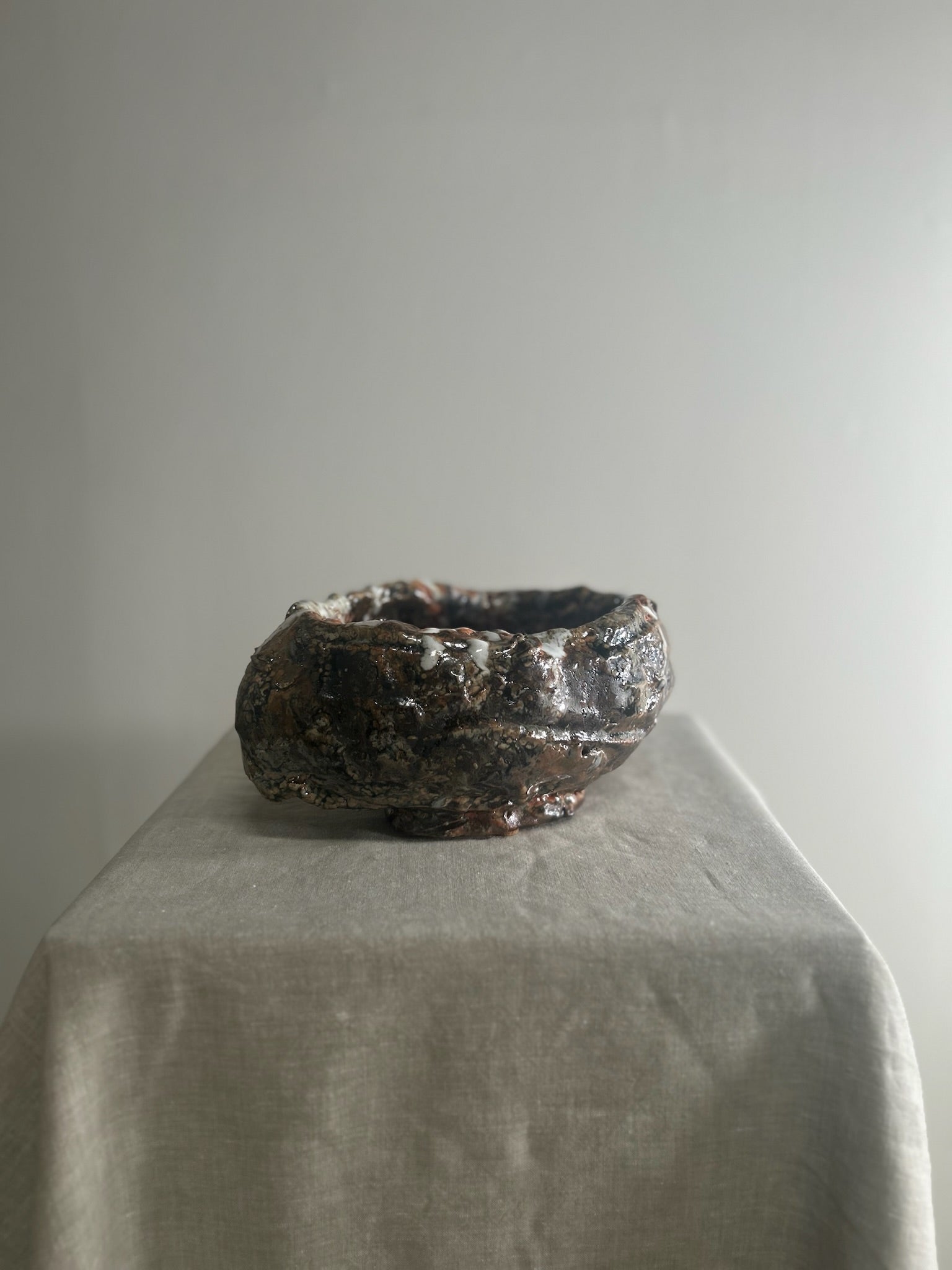 This hand-built ceramic vessel by David Stone features a heavily textured surface and layered glaze in tones of rust, ash, and smoke. The irregular silhouette echoes geological formations—raw, grounded, and elemental.