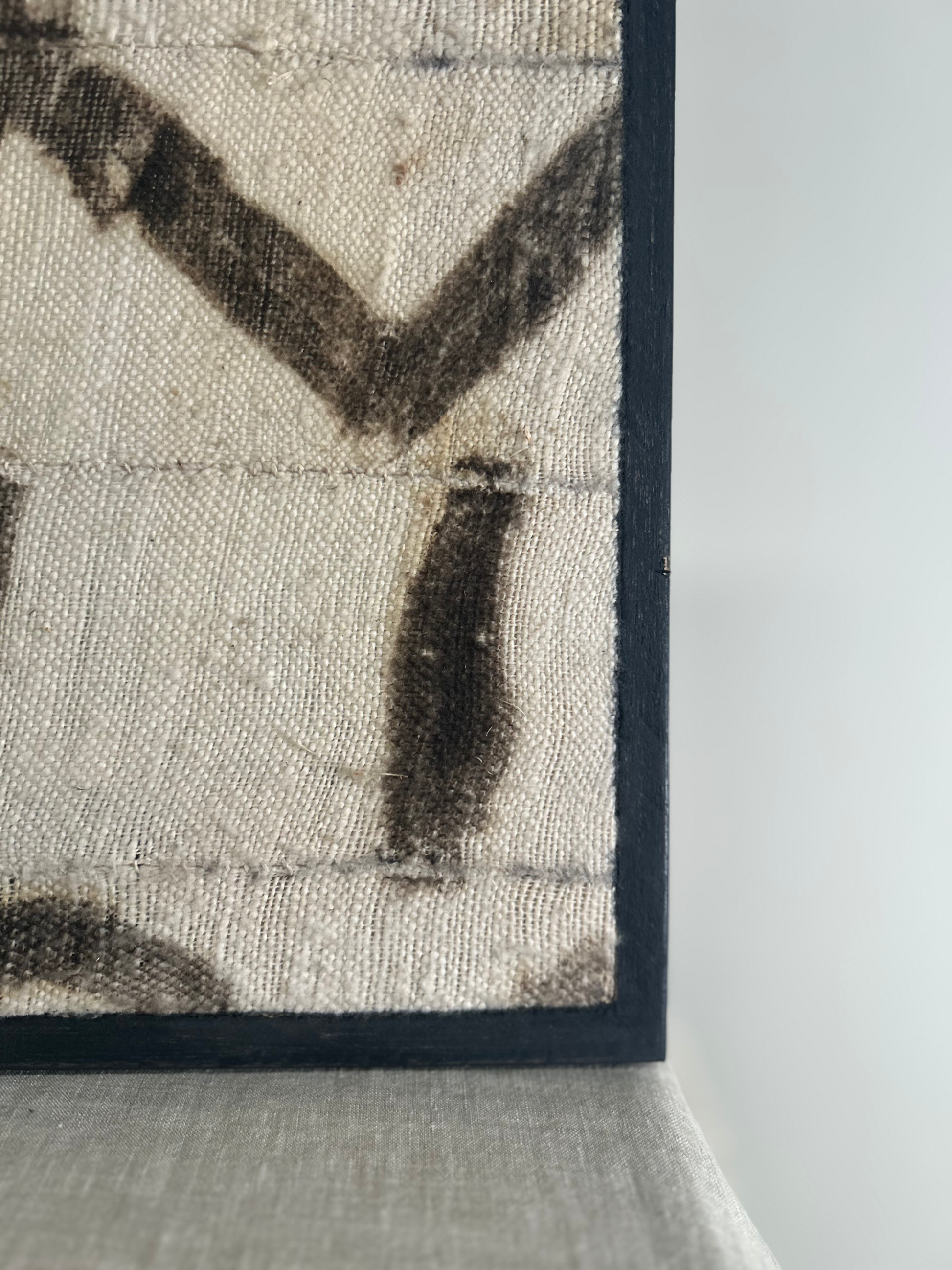 These framed textiles feature bold geometric forms painted with fermented mud onto handwoven cotton, using traditional bogolanfini techniques. The rhythmic zigzags and vertical marks recall both landscape and language, patterns passed down through time that speak across generations. A balance of form and imperfection lends the work a grounded, timeless presence.