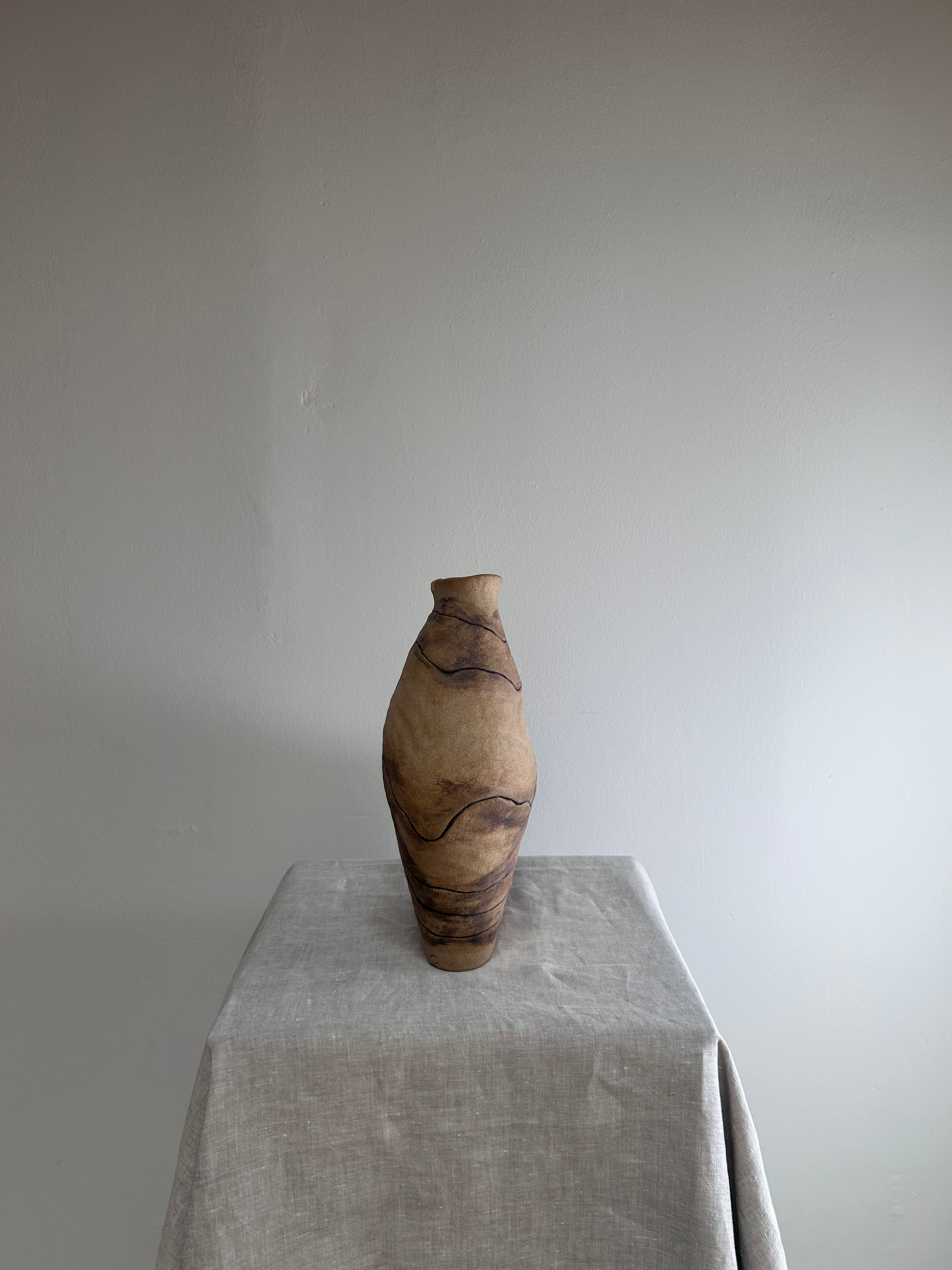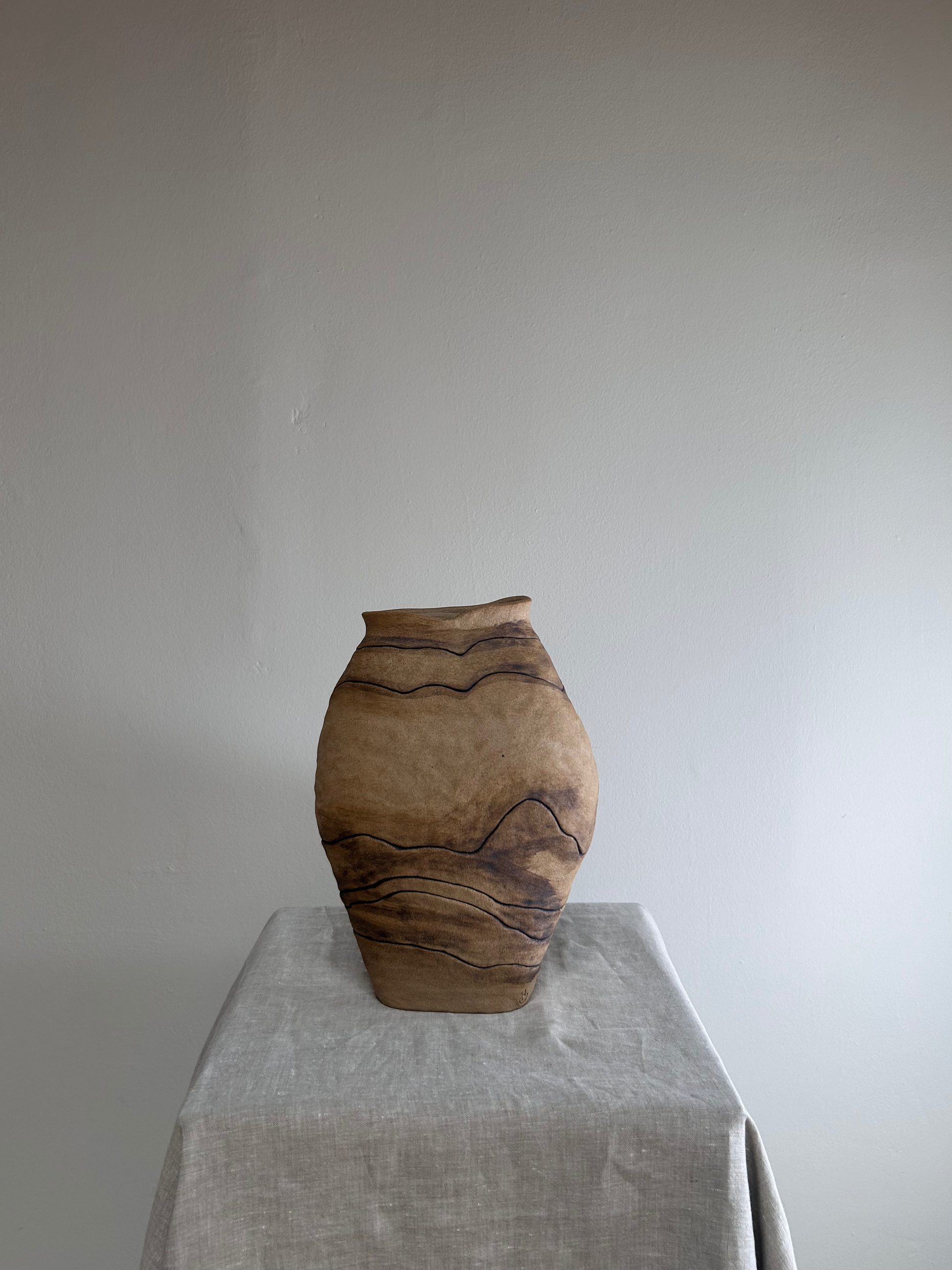 Sand and grey striped vase with soft curves and layered lines, this vase evokes the feel of shifting tides and desert landscapes. The sand and grey palette gives it a warm, organic presence that feels both grounded and fluid.